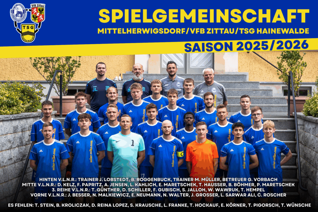 2. Männermannschaft 2. MÄNNERMANNSCHAFT | Saison 2025/26 - in Bearbeitung Mannschaftsfoto 2. Mannschaft 2025/26 Spielgemeinschaft mit– Traktor Mittelherwigsdorf– TSG HainewaldeSpielklasse1. Kreisklasse St. 3 Spiel- und TrainingsortWeinau & MittelherwigsdorfTrainingstageDienstag und Donnerstag 18.30 – 20:00 UhrÜbungsleiterMarcel Müller – Telefon: 01727656371Jochen Lobstedt – Telefon: 015202590462E-Mail: jochenlobstedt@t-online.de Vorschau / Letzte Spiele Kader